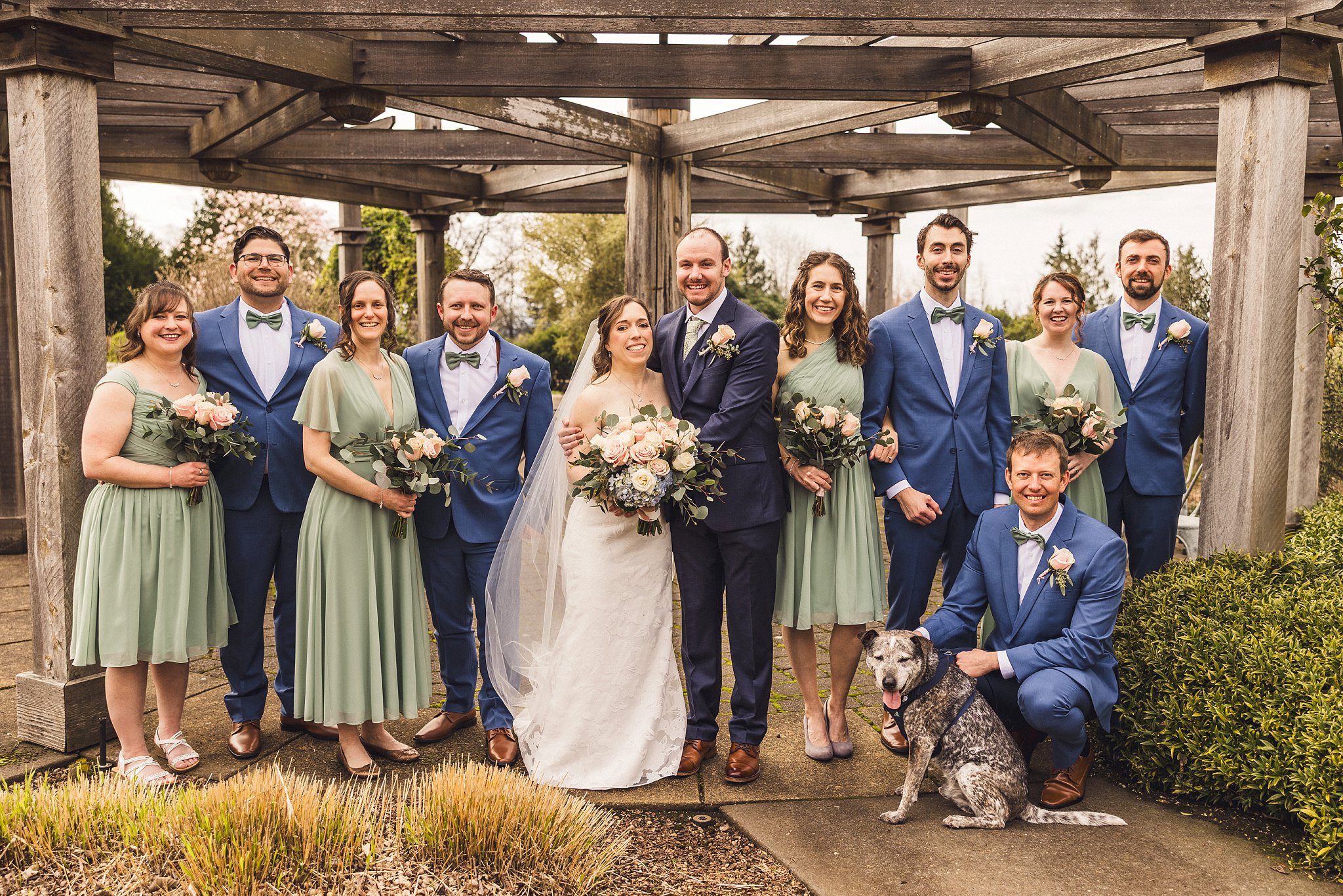 Take Sara and Alex’s wedding, for example. They intentionally chose a pet-friendly venue and included their dog, Ray, as their “Dog-of-Honor.” Ray wore a cute outfit, had a dedicated dog handler for times the couple couldn’t be with him, and even walked down the aisle with the best man. The handler brought Ray to us for photos and returned him afterward. Moments like these, especially when he happily walks back down the aisle with the couple, create memorable, heartwarming photos that they’ll treasure for years.
