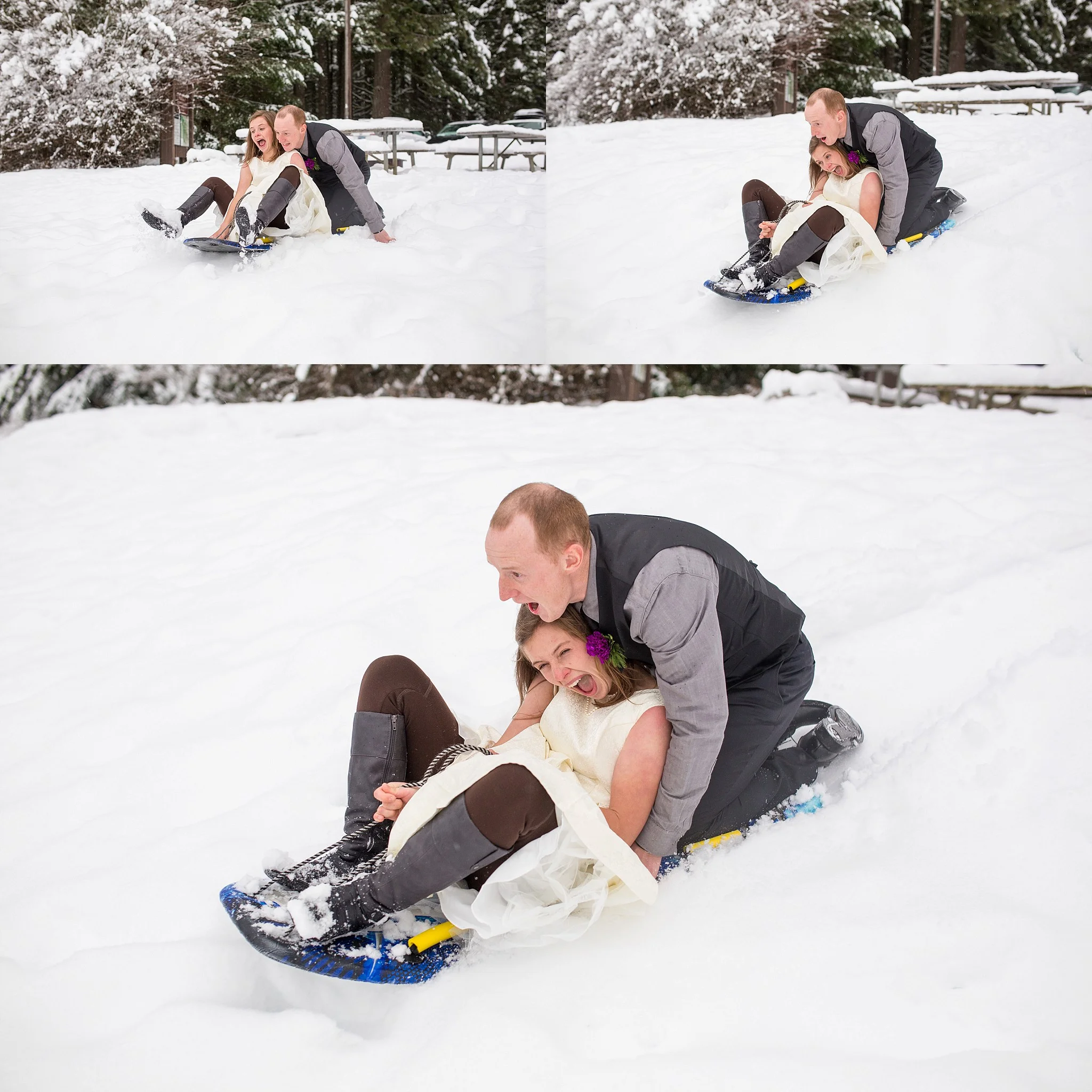 No, but really, Shirine and Kevin’s wedding day was magical. The snow storm rolled in that morning and coated everything with the prettiest of fluffy goodness and despite the roads being quite horrible to drive on, so much so that at one point Kevin had to take over for me and get us up a slippery hill on our way back from taking photos at the falls, despite all that, they were literally skipping through the snow, so excited and happy to be starting their life together as husband and wife. I met them at the New Ranch at Silver Falls State Park after my hour and a half (normally 20 minutes) white knuckled drive in the snow. They were ready and excited to take pictures and I was just elated that the snow had turned what is already a gorgeous location into an absolute dreamland. The flakes were ENORMOUS! We took photos around the North Falls area before heading back to the New Ranch where their friends and family were waiting cozily around a big fireplace. They had a short and sweet ceremony with personalized vows they had written for each other. Immediately after their vows, we popped outside and Shirine grabbed a sled and pulled Kevin on and said “Let’s go!” and they rode down the hill together, not 2 minutes after saying I do! How fun are they??